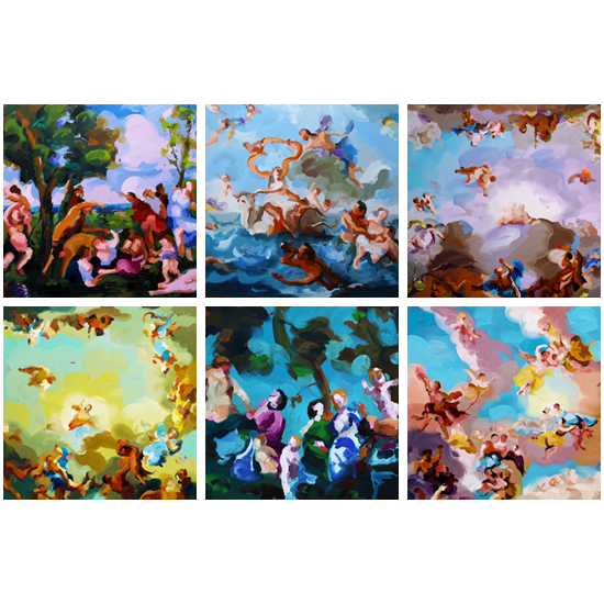 These works take European signifiers of status and authority as their subject matter; frescos, ceilings and Baroque/Rococo architectural spaces. This era is often portrayed as decadent and indulgent, but its exuberance and its opposition to strict Classical rules is enormously appealing. The works are intended to capture this dichotomy.