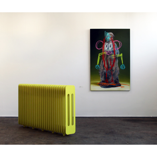 The pieces reference real-world objects, but there is always non-functional aspect to the works; wooden radiators, foam wall-paper patterns, MDF traffic lights. The contradictory use of materials is part of this dynamic.