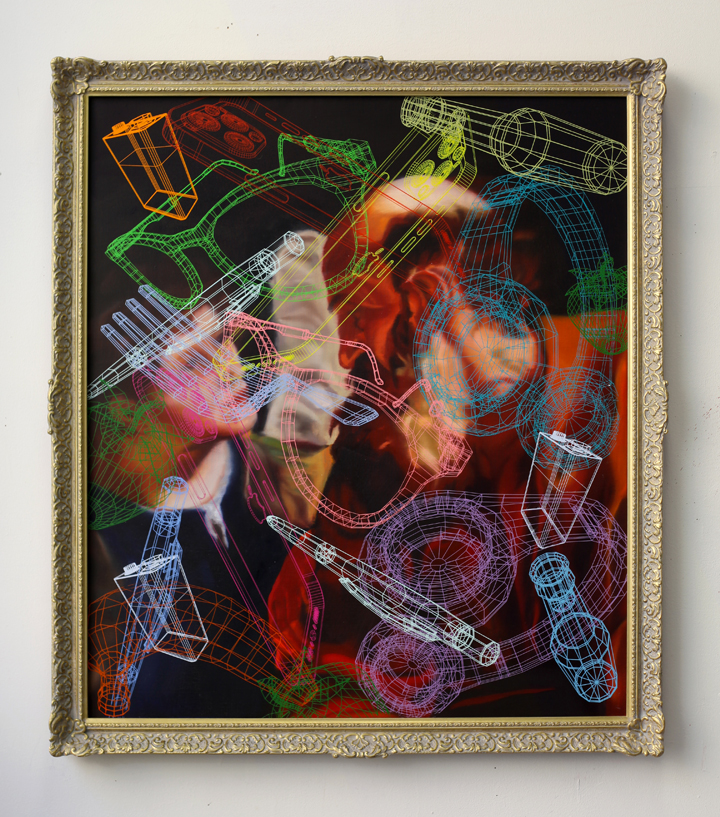 This series of works of "marked paintings" start out with a representational underpainting which is then overlaid with a variety of marks made with spray paint, marker pen, oil crayon and various other materials. The underpainting typically depicts a luxurious interior space or figuration that denotes status and authority. The over-layer is formed of gestural marks which are freely scribbled, calligraphic and graffiti like; this layer has a spontaneity that challenges the coherence and perfection of the underlying imagery. The resulting works sit somewhere between a painting that has been used as a blackboard and a screensaver backdrop to a computer screen.